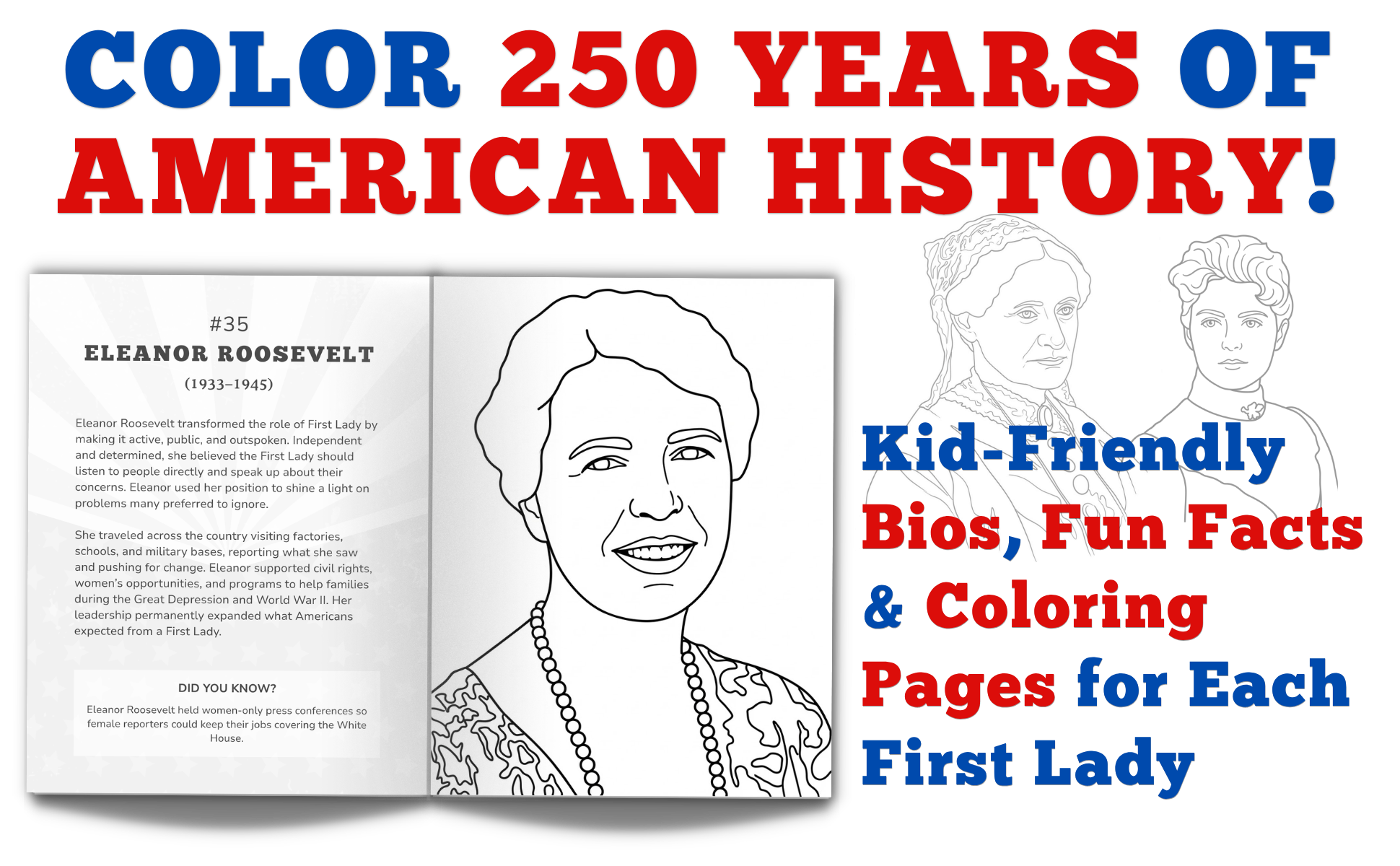 Meet the Presidents and Meet the First Ladies are companion coloring books that introduce young readers to the people who led the United States—both in public office and behind the scenes. Each book combines iconic portraits, accessible biographies, and creative activities that make American history engaging, human, and easy to explore. Sign up here for news about our next educational coloring book releases.